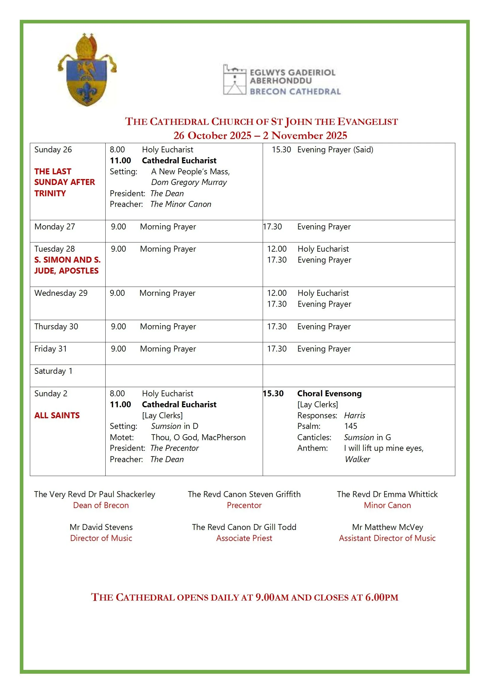 Monday - Friday 9.00am Morning Prayer, 5.30pm Evening Prayer